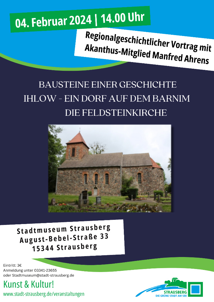Am 04.02.2024 wird Manfred Ahrens vom Akanthus Verein für Stadt- und Regionalgeschichte – Strausberg einen Vortrag über das Dorf Ihlow der Gemeinde Oberbarnim im Stadtmuseum Strausberg halten.