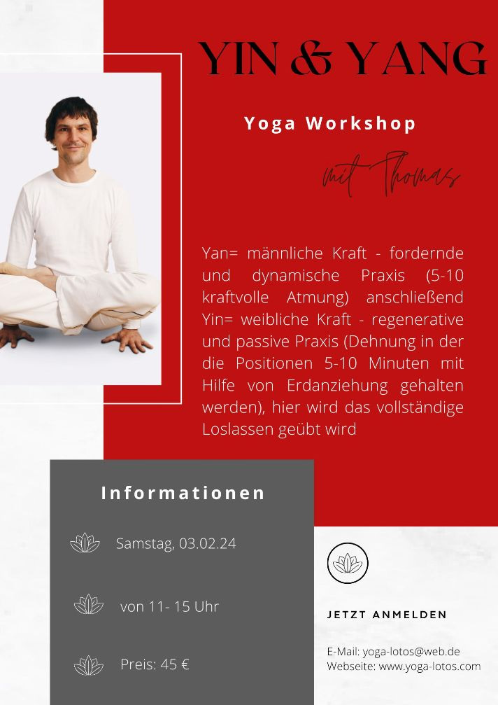 Die Yogaschule Lotos bietet am Samstag, den 03. Februar 2024 von 11:00 Uhr bis 15:00 Uhr einen Yin & Yang Workshop mit Thomas an.
