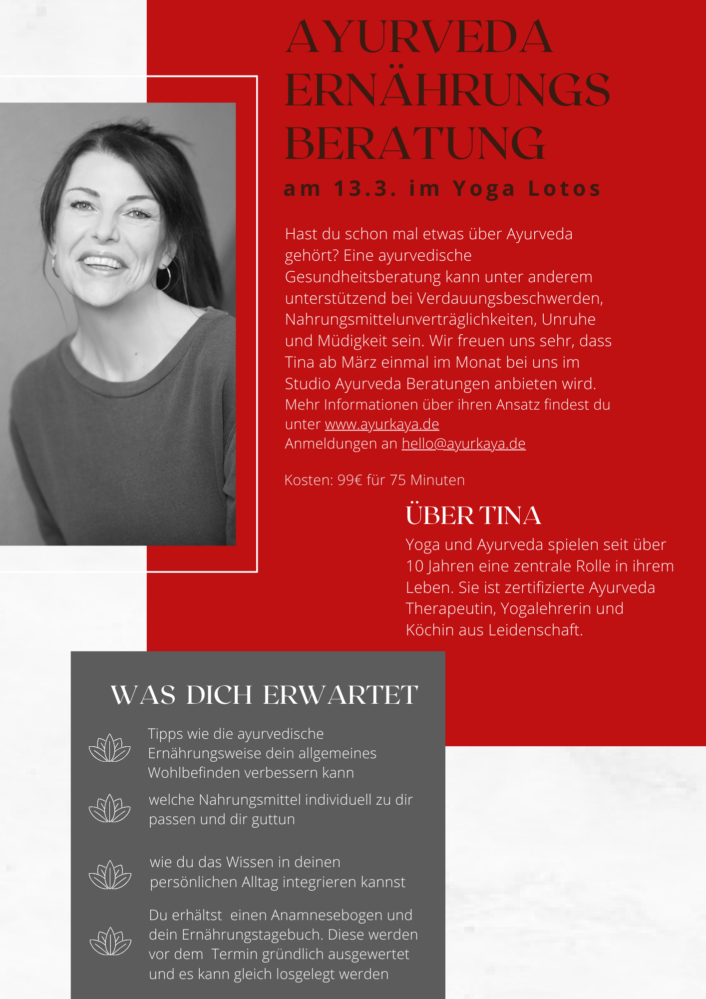 Am 13. März 2024 findet ab 11:00 Uhr im Yoga Lotos in der Schulstraße in der Strausberger Altstadt eine Ayurveda Ernährungsberatung die Tina, eine zertifizierte Ayurveda Therapeutin, Yogalehrerin und Köchin aus Leidenschaft ist.