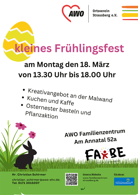 Am Montag, den 18. März 2024 wird von 13:30 Uhr bis 18:00 Uhr vom AWO Familienzentrum, Am Annatal 52 a, in Strausberg ein kleines Frühlingsfest organisiert.
