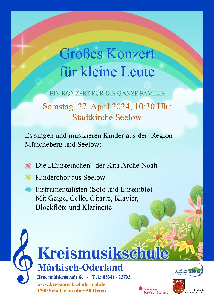 Am Samstag, den 27. April 2024 findet ab 10:30 Uhr in der Stadtkirche Seelow ein großes Konzert für kleine Leute - ein Konzert für die ganze Familie statt. Die Kreismusikschule Märkisch-Oderland lädt ein. Es musizieren Kinder aus der Region Müncheberg und Seelow.