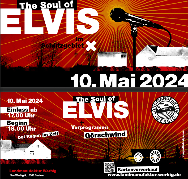 Die Landmanufaktur Werbig lädt am 10. Mai 2024 ab 18:00 Uhr zum Konzert The Soul of Elvis mit dem Vorprogramm Görschwind.
