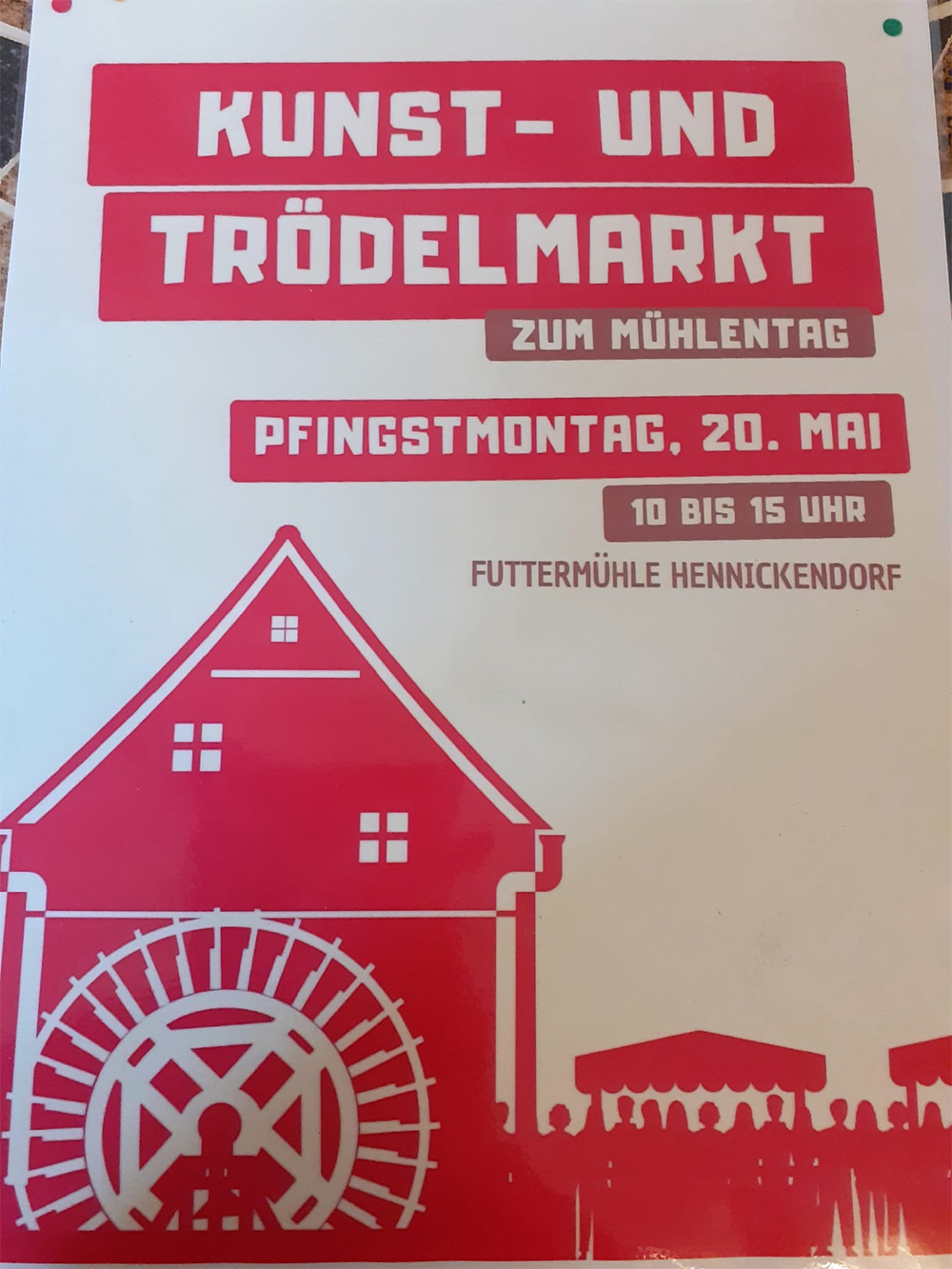 Am Pfingstmontag, den 20. Mai 2024 findet von 10:00 Uhr bis 15:00 Uhr der Kunst- und Trödelmarkt zum Mühlentg in der Futtermühle in Hennickendorf statt.
