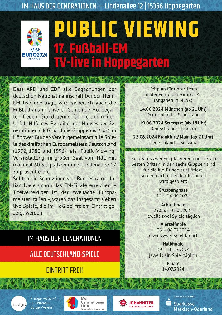 Urheber: Dr. Gabriele Stolze Im Haus der Generationen in Hoppgarten werden Spiele der Fußball Europameisterschaft als Public Viewing im Großen Saal gezeigt. Dies sind unter anderem die Vorrundenspiele des deutschen Teams: