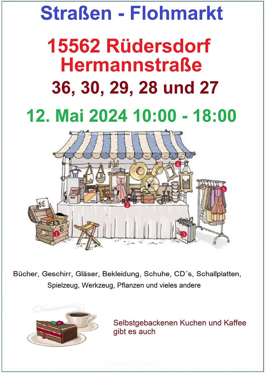 Am Sonntag, den 12. Mai 2024 findet von 10:00 Uhr bis 18:00 Uhr in Rüdersdorf in der Herrmannstraße 36, 30, 29, 28 und 27 ein Straßenflohmarkt statt.
