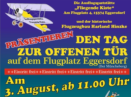 Am Samstag, den 03. August 2024 ab 11:00 Uhr lädt die Ausflugsgaststätte Flieegnde Kiste und der historische Flugzeugbau Harland Hinzke zum Tag der offenen Tür auf dem Flugplatz Eggersdorf bei Müncheberg ein. Der Eintritt ist frei.