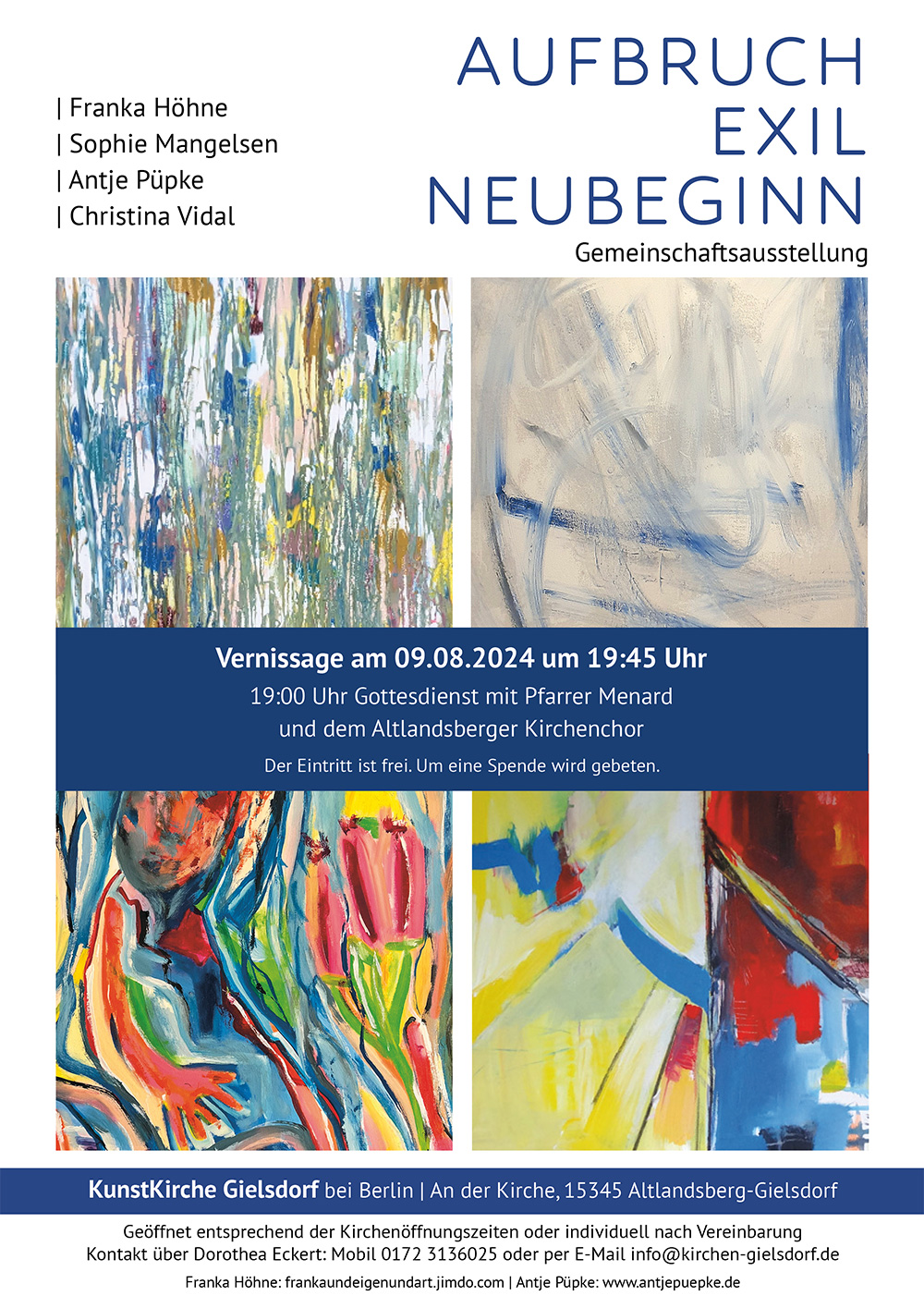 Vom 9. bis 11. August 2024 feiert Gielsdorf sein diesjähriges Sommerfest. Die Künstlerinnen Franka Höhne, Sophie Mangelsen, Antje Püpke und Christina Vidal eröffnen die aktuelle Ausstellung „Aufbruch, Exil, Neubeginn“ in der KunstKirche in Gielsdorf am Freitag, den 09.08.2024 im Anschluss an den Gottesdienst, der um 19 Uhr beginnt. Der Kirchenchor begleitet die Vernissage. Anschließend lädt die evangelische Kirchengemeinde zum Grillen auf dem Kirchplatz.