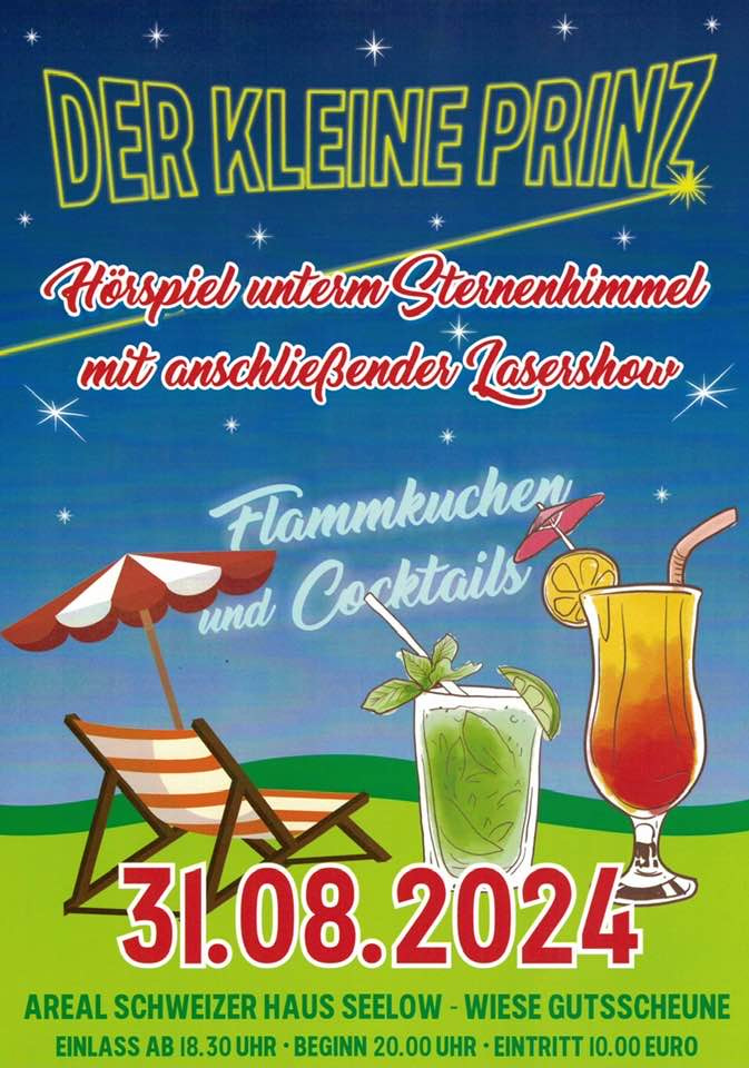 Am Samstag, 31. August 2024 gibt es ab 20:00 Uhr das Hörspiel untrm Sternenhimmel im Areal Schweizer Haus in Seelow - Wiese Gutsscheune. Zu hören ist Der kleine Prinz. Es gibt Flammkuchen und Cocktails. Der Einlass ist ab 18:30 Uhr, der Eintritt kostet 10,00 Euro.
