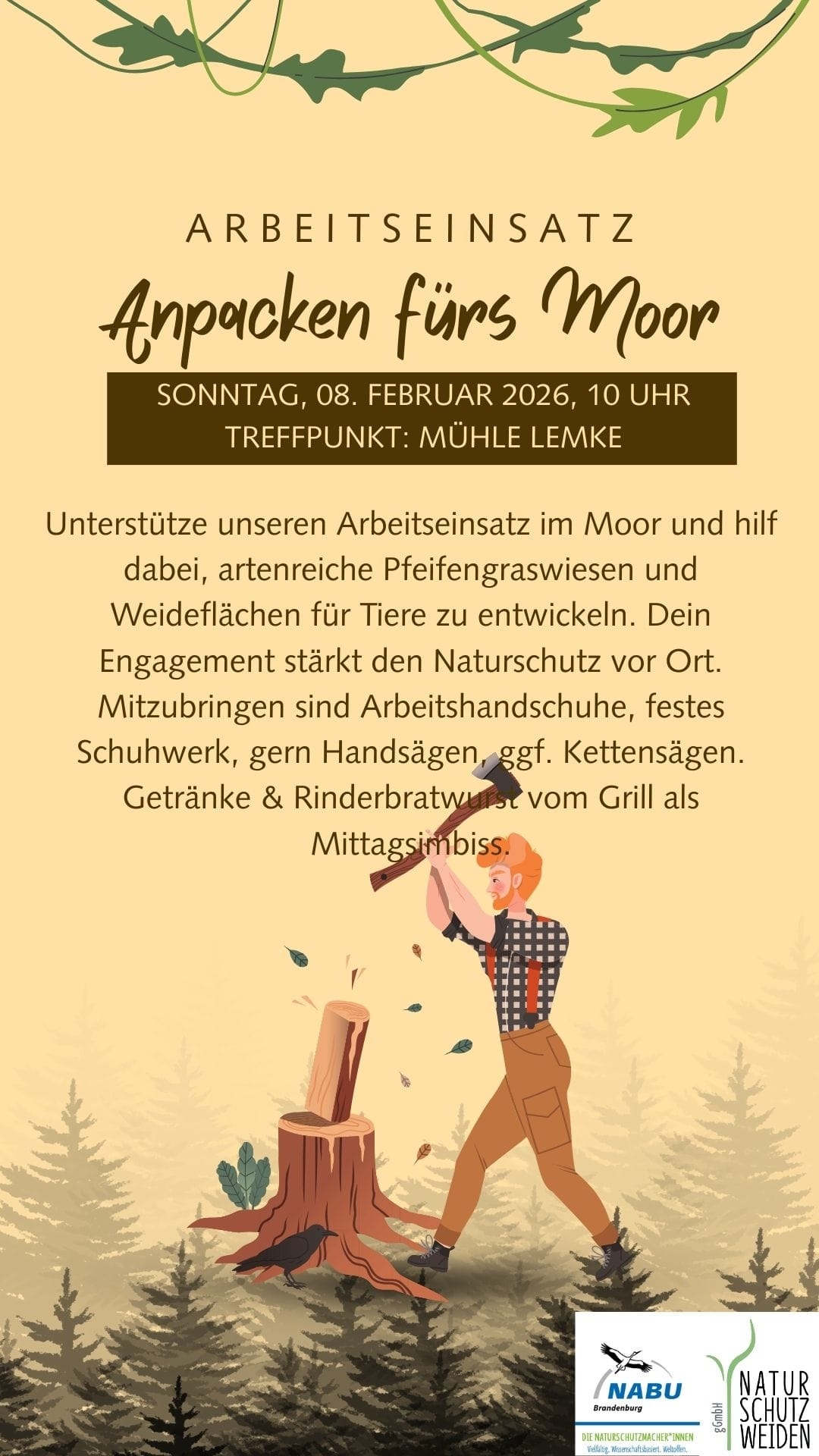 Unterstütze den Arbeitseinsatz im Moor und hilf dabei, artenreiche Pfeifengraswiesen und Weideflächen für Tiere zu entwickeln. Dein Engagement stärkt den Naturschutz vor Ort.
