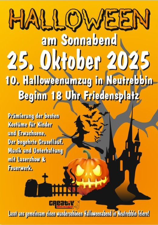 Am Samstag, den 25. Oktober 2025 findet ab 18:00 Uhr der 10. Halloweenumzug in Neutrebbin statt. Er beginnt traditionell am Friedensplatz. Die besten Kostüme für Kinder und Erwachsene werden prämiert. Musik und Unterhaltung gibt es mit DJ Timo. Auch eine Lasershow und Feuerwerk sind geplant.