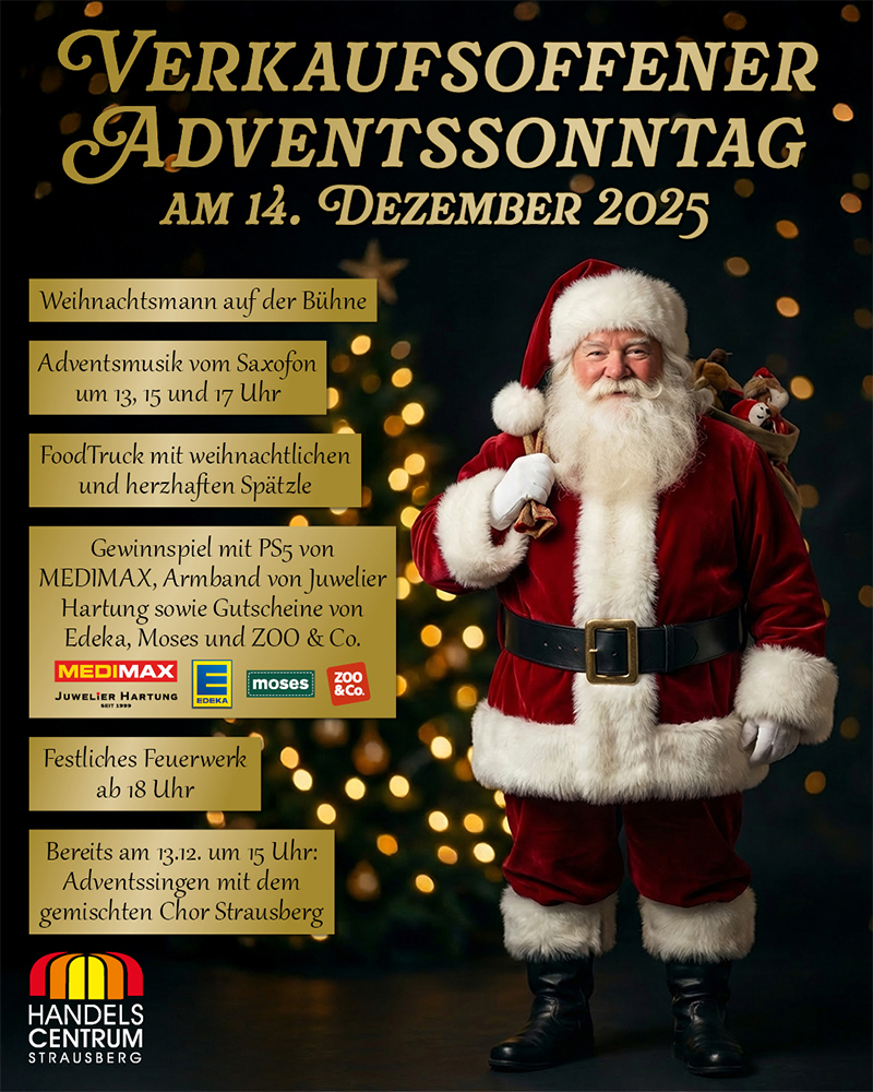 Am 14. Dezember 2025 lädt das Handelscentrum Strausberg von 13:00 Uhr bis 18:00 Uhr zu einem festlichen verkaufsoffenen Sonntag ein. Besucherinnen und Besucher dürfen sich auf ein abwechslungsreiches Adventsprogramm für die ganze Familie freuen.