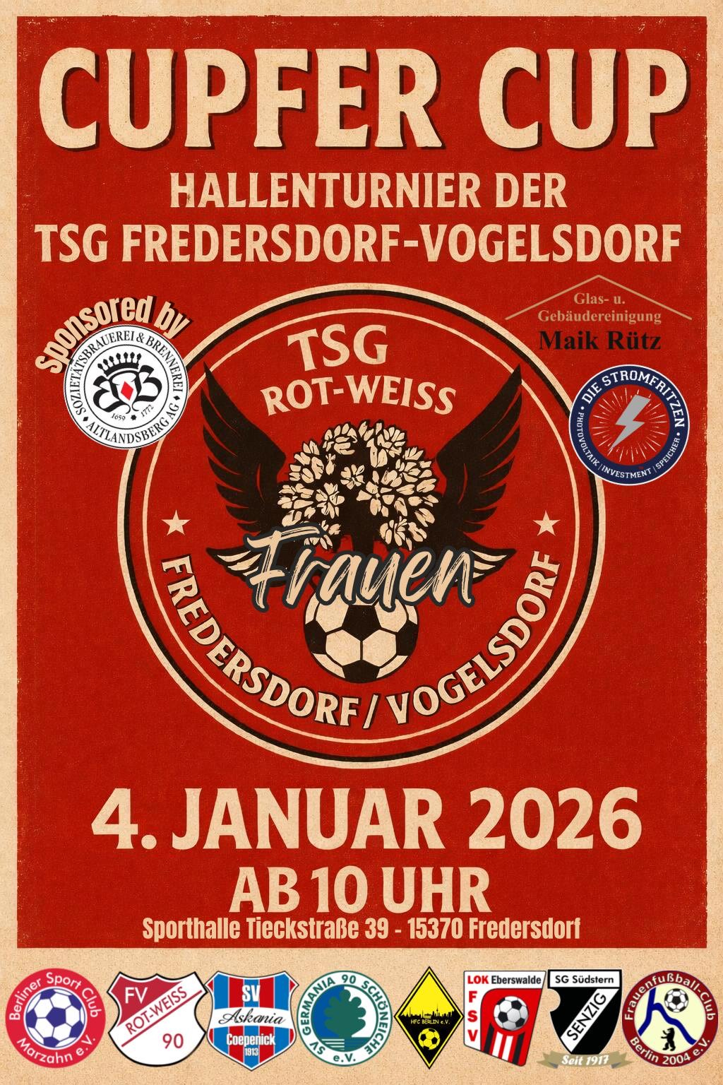 Die TSG Rot-Weiss Fredersdorf-Vogelsdorf veranstaltet am 04. Januar 2026 ab 10:00 Uhr den 1. Cupfer Cup, ein Frauen-Fußballturnier zum Jahresbeginn.