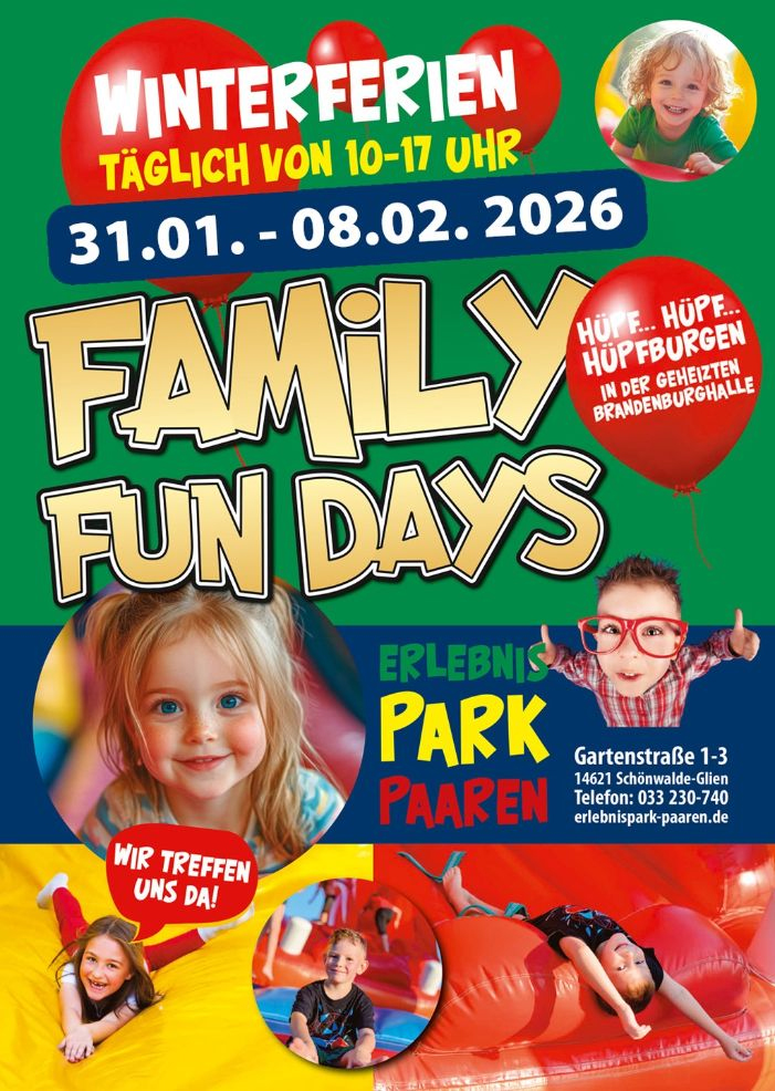 Schönwalde-Glien: Vom 31. Januar bis 8. Februar 2026 von 10:00 Uhr bis 16:00 Uhr, laden die Family Fun Days im Erlebnispark Paaren zu einer willkommenen Auszeit ein. Hier können Sie gemeinsam entschleunigen mit Bewegung, Spiel und Spaß wieder aktiv werden.