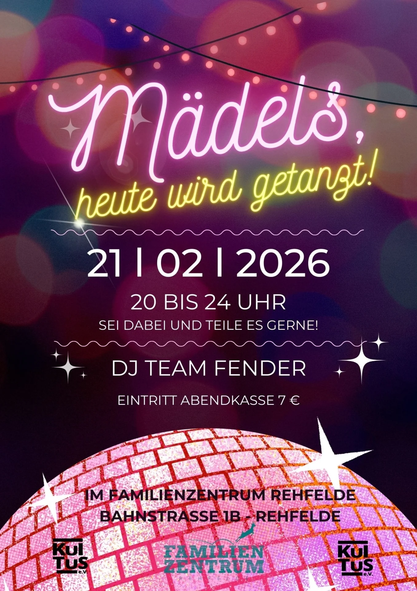 Am Samstag, den 21. Februar 2026, findet im Familienzentrum Rehfelde eine Tanzveranstaltung speziell für Frauen statt. Unter dem Motto „Mädels, heute wird getanzt!“ lädt der Verein KulTus e.V. gemeinsam mit dem Familienzentrum zu einem gemeinsamen Abend in geselliger Atmosphäre ein.