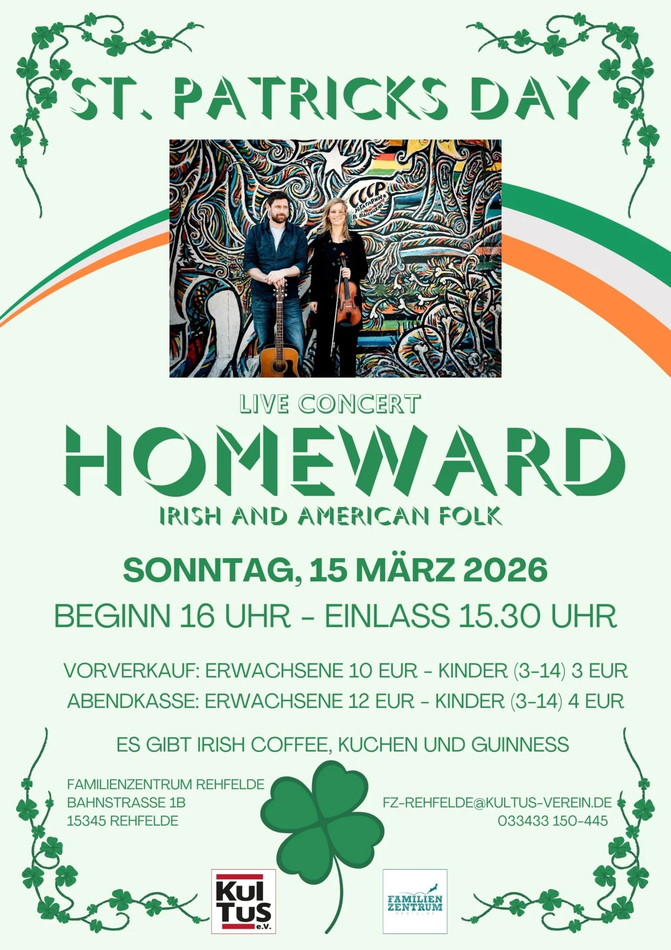 Erleben Sie einen stimmungsvollen Nachmittag zum St. Patrick’s Day! Das Duo Homeward gastiert im Familienzentrum Rehfelde und nimmt Sie mit auf eine musikalische Reise durch Irland und Amerika.