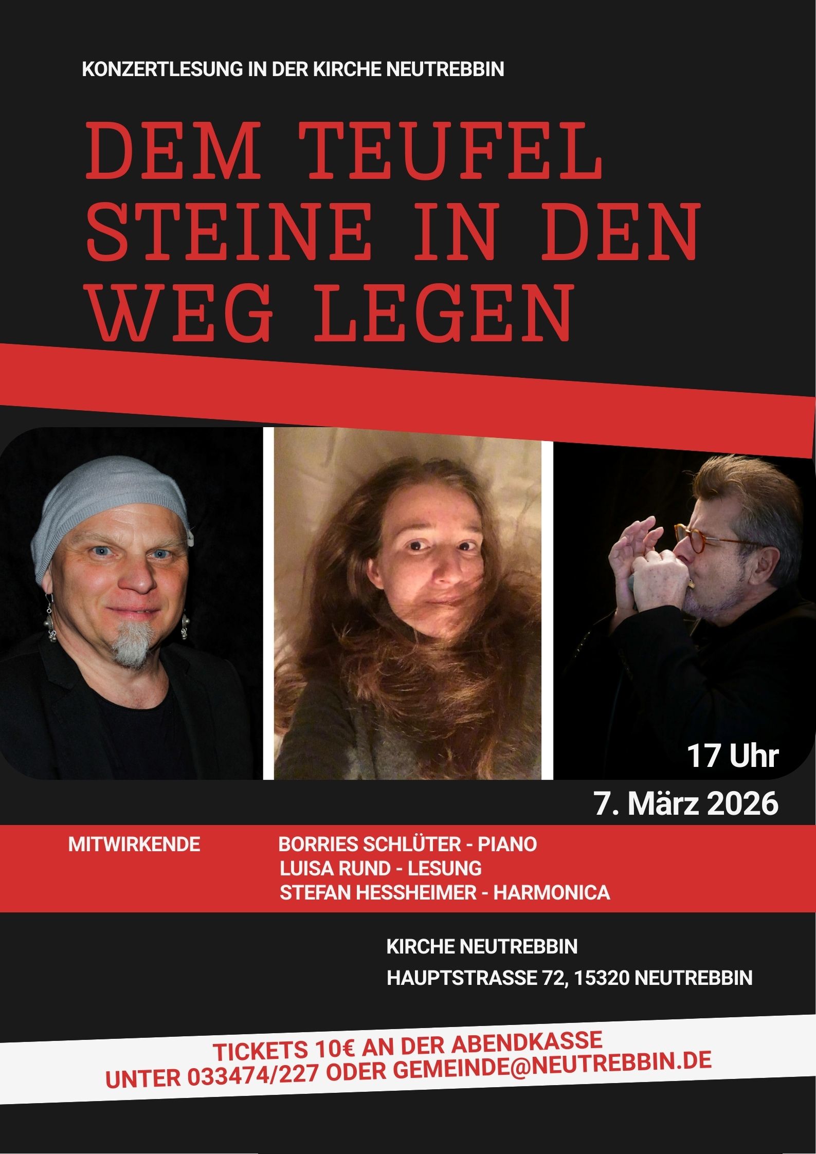 Ein Abend, der Literatur, Musik und ein kleines bisschen Teufelswerk vereint – so könnte man die Konzertlesung „Dem Teufel Steine in den Weg legen“ beschreiben. Am 7. März 2026 um 17:00 Uhr lädt die Kirche Neutrebbin alle Neugierigen und Liebhaber literarisch-musikalischer Abende ein, einen Blick auf das zu werfen, was Goethe, Bulgakow und Mickiewicz über das Böse, das Spiel mit dem Teufel und die Kraft des Guten zu erzählen haben.